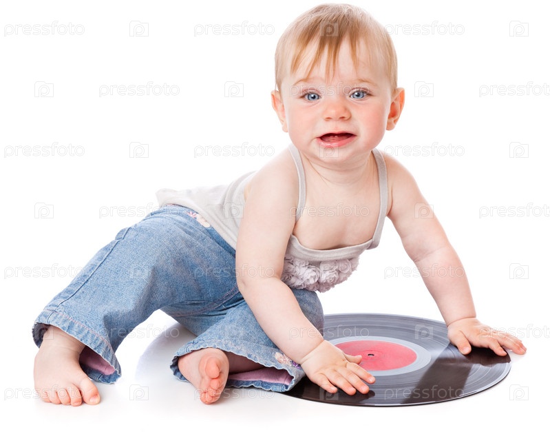 Маленький ребенок с виниловой пластинкой на белом фоне