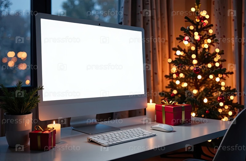 Компьютерный монитор с белым экраном макет на столе в уютном домашнем офисе рождественского декора с елкой и окном со снежной зимой снаружи