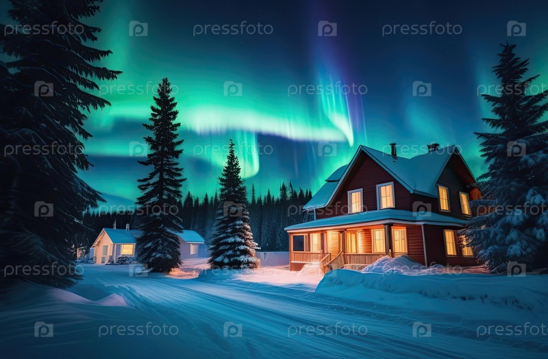 Северные огни в небе над северной деревней со снежными уютными домами зимой
