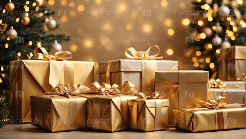 Рождественский фон с подарочными коробками с луками в ярких золотых тонах, боке и фейри-светом, рождественская елка во внутреннем интерьере дома. Праздничное настроение Рождество и Новый год, открытка. ИИ генерируется