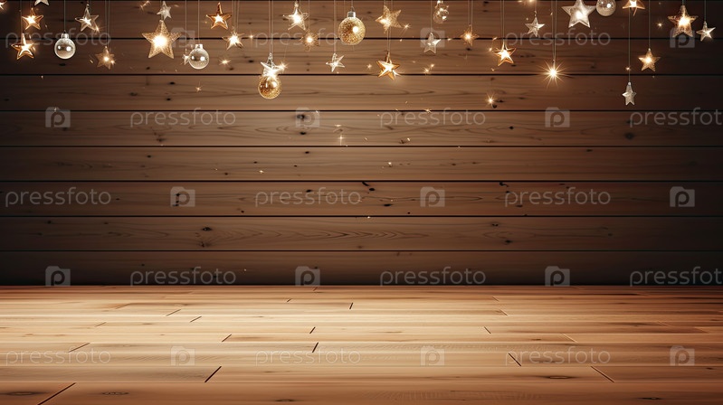 Пустой деревянный пол и стена для монтажа продуктового дисплея с рождественским декором, боке, секины и фейры. Копирование пространства, Рождество и Новый год. ИИ генерируется