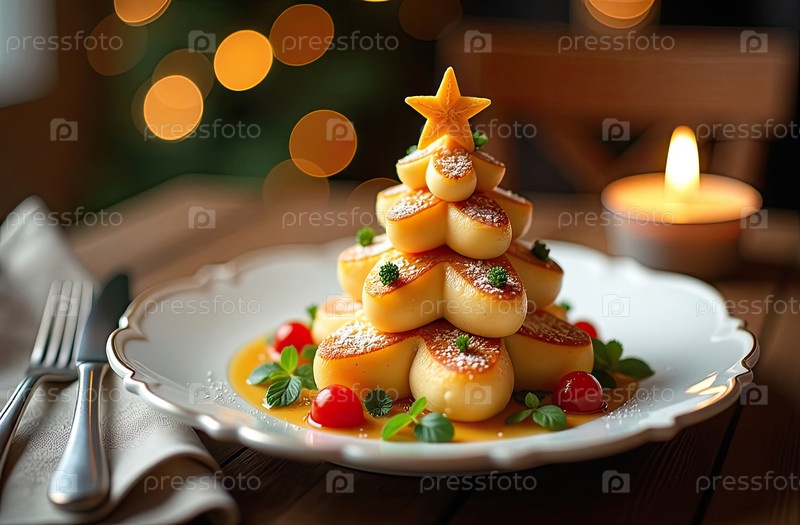 Вкусные выпечки печенье в виде рождественской елки из ягод, листьев мяты на праздничном новогодном столе. Рецепт и красивая презентация. Рождественский декор и установка стола. ИИ генерируется