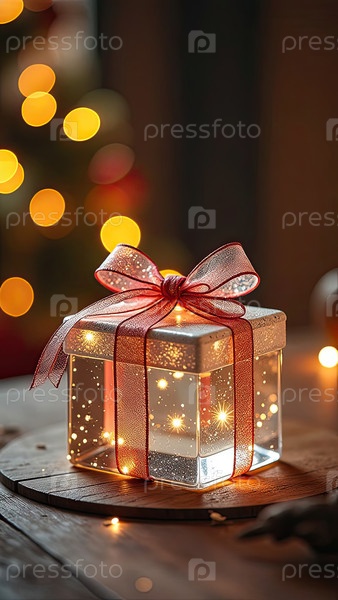 Золотая прозрачная светящаяся коробка для подарков на праздничном фоне с гирляндами боке с пространством для текста. Поздравления, открытки, фон Рождества и Нового года. ИИ генерируется