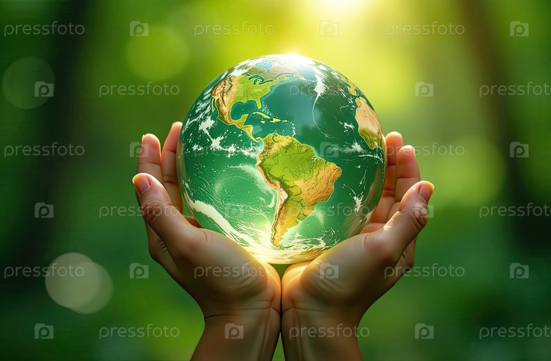 Стеклянная светящаяся сфера планеты Земля На ладонях находится шар с внутренним микроклиматом, заботой о планете, чистой окружающей среде, защитой экологии, географии, континентов, путешествий
