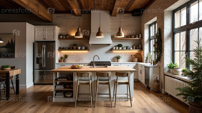 Верхний интерьер уютной современной рождественской кухни, новогоднее настроение, подготовка к празднику, посуда. Рождественский декор современной кухни, снег снаружи окна. ИИ генерируется