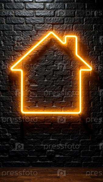 Прозрачное золото светящийся символ дома на фоне черной кирпичной стены с золотым блеском. недвижимость, риэлтор, ипотека, страхование, бронирование, строительство, изоляция, отопление. AI generated