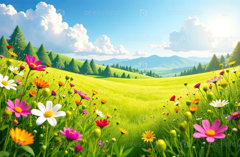 Весеннее зеленое поле, розовые и желтые цветы, ярко-голубое небо, свежий природный фон для сезонного дизайна