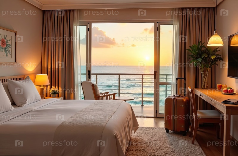 Интерьер гостиничного номера с видом на океан для пляжного отдыха и путешествий