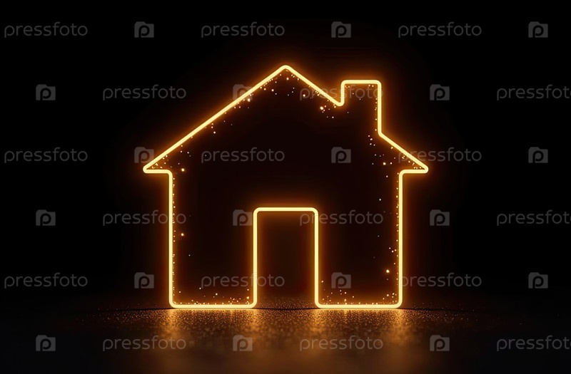 Прозрачное золото светящийся символ дома на черном фоне с золотым блеском. недвижимость, риэлтор, ипотека, страхование, бронирование, строительство, изоляция, отопление. AI generated