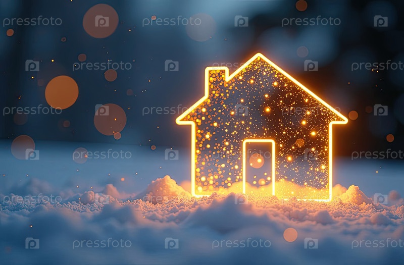 Прозрачное золото светящийся символ дома на снегу и заснеженном фоне с золотым блеском. недвижимость, риэлтор, ипотека, страхование, бронирование, зимовка, изоляция, отопление. ИИ генерируется