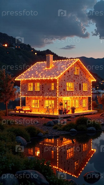 Прозрачное золото светящийся проект дома в натуральном размере на земельной площади. недвижимость, риэлтор, ипотека, страхование, здания, строительство, изоляция, отопление. ИИ генерируется