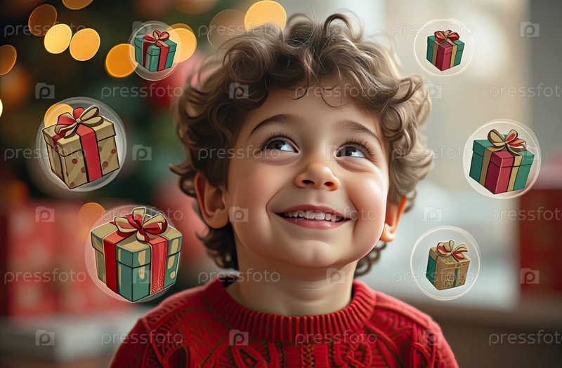 Криклый мальчик в красном шерстяном свитере мечтает о подарках на Новый год - большие мультфильмы, нарисованные кругами со символами подарков внутри