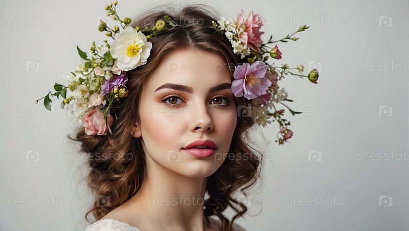 Белая женщина с волосами до плеч и пастельными дикими цветами, портрет весенней красоты, свежая элегантность, цветущая атмосфера