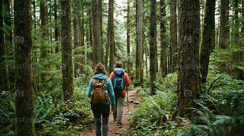 Группа взрослых и подростков, идущих в поход через густой зеленый лес, исследования на открытом воздухе, приключенческие путешествия, здоровый образ жизни, командная работа