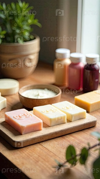 Ручно сделанный натуральный эко-сапун на деревянном столе с бутылками с ароматизатором, красителем и мыльной основой. Подарок, подарок, ремесленная домашняя гигиена. Хоби изготовление мыла, дома сделано. ИИ генерируется;