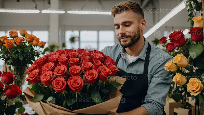 Счастливый европейский цветочник с большим букетом красных роз, доставка в магазине на День святого Валентина, годовщину и свадьбу