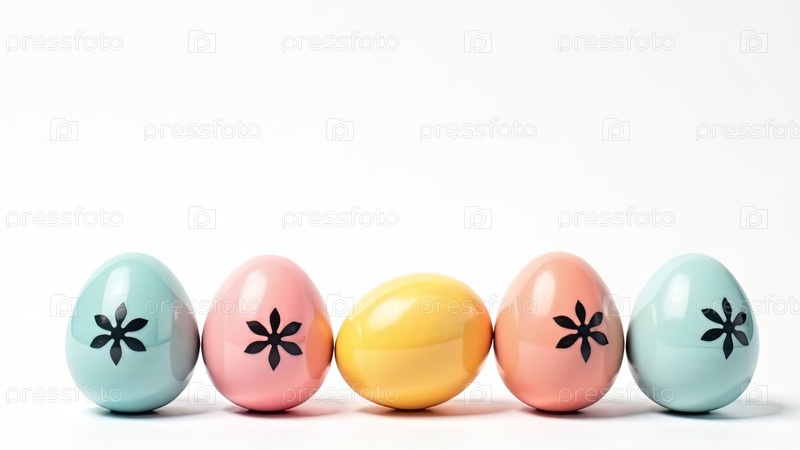 Внизу изображения пять яиц со свободным пространством сверху для текста, творческий цветочный черный рисунок на цветах-яйцах, белый фон. Пасхальный баннер с пробелом для текста. ИИ генерируется
