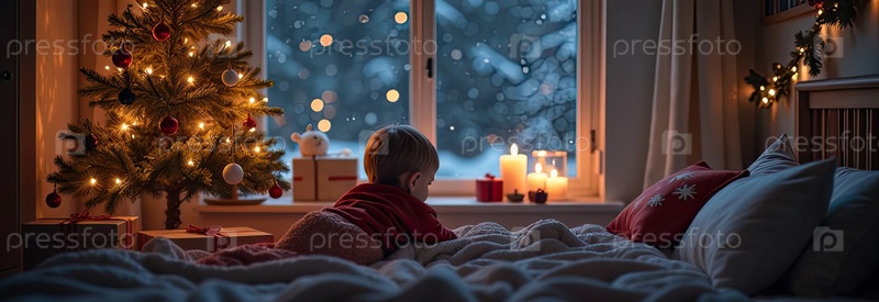 Ребенок спит в кровати в уютной спальне с рождественской елкой и теплыми гирляндами света и свечами - вид из окна зимой и снегом