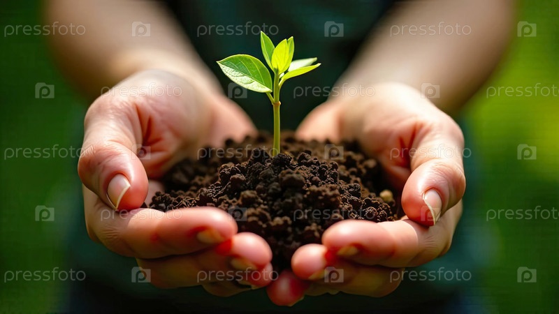 Молодой зеленый побег в горстке земли в ладонях фермера растений в земле на близком расстоянии
