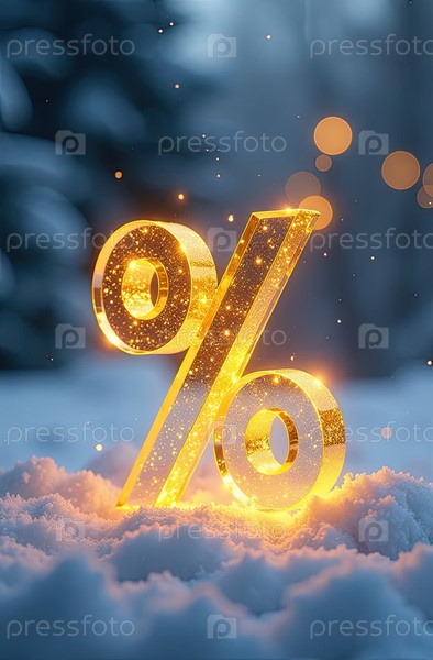 Неон светящийся золотой процентный знак на снежном фоне снаружи, блеск и снежинки. Зимняя распродажа и скидки, Черная пятница, Новый год, Рождество. баннер, флаер с копировальным пространством. ИИ генерируется