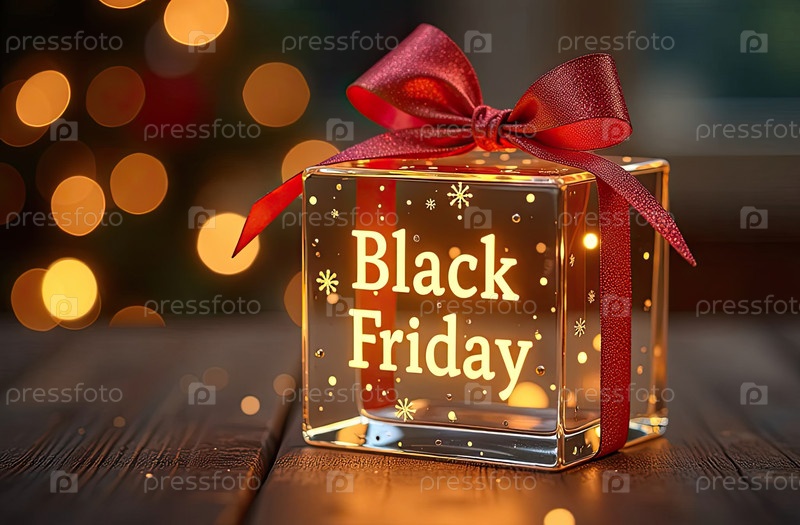 Неоновые светящиеся золотые буквы "Черная пятница" на прозрачной подарочной коробке с праздничным фоном золотистого бока. витрина магазина для Черной пятницы, распродажи, скидки, листовки, созданные ИИ