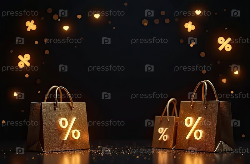Неоновая светящаяся золотая рама с пространством для текста, процентный знак, сумки покупок на черном фоне. витрина магазина в Черную пятницу, распродажа, скидки, баннер, флаер. ИИ генерируется