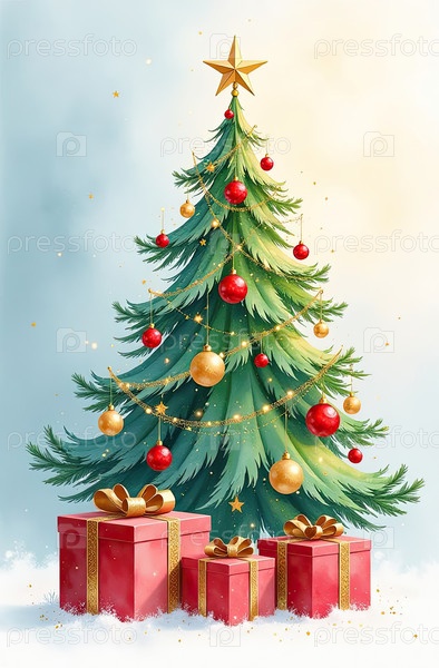 Акварельная зеленая рождественская елка и коробки для подарков на сияющем фоне.Поздравление к Рождеству и Новому году.Искусственный интеллект создан