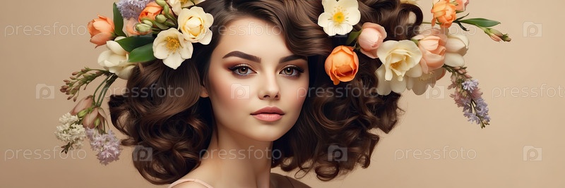 Брюнетка с светлыми локонами и бежево-розовой цветочной короной, портрет весенней красоты, женственность, свежесть, флористика, романтика, 8 марта, женский день