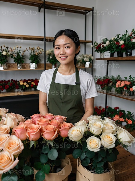 Азиатская цветочная женщина готовит букеты белых, персиковых и розовых роз на лунный Новый год, свадьбы и открытия бизнеса