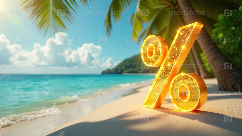 Яркий золотой процентный знак на берегу моря с тропическими пальмами в свете солнца, туристический морской фон. жаркая летняя распродажа и скидки, горящий тур-баннер, флаер. ИИ генерируется