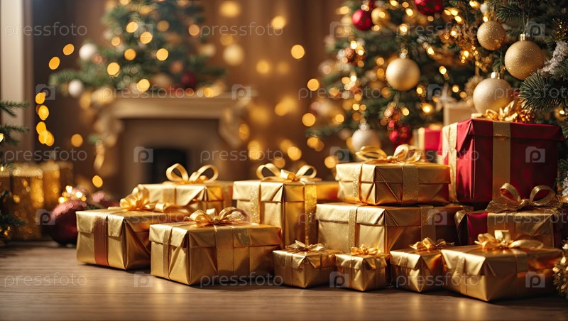 Рождественский фон с подарочными коробками с луками в ярких золотых тонах, боке и фейри-светом, рождественская елка во внутреннем интерьере дома. Праздничное настроение Рождество и Новый год, открытка. ИИ генерируется