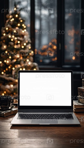 Ноутбук с белым экраном макет на столе в офисе рождественского декора с огнями боке, свечами, сверхурочной работой по праздникам, домашний офис, черная пятница,