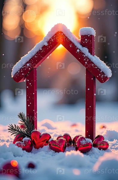 Уютный красный крошечный дом на снегу в солнечных лучах, украшенный красным сердцем и декором Валентина