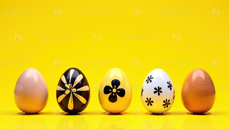 В нижней части изображения пять яиц со свободным пространством сверху для текста, творческий цветочный черный рисунок на цветах яйца, желтый фон. Пасхальный баннер с пробелом для текста. ИИ генерируется