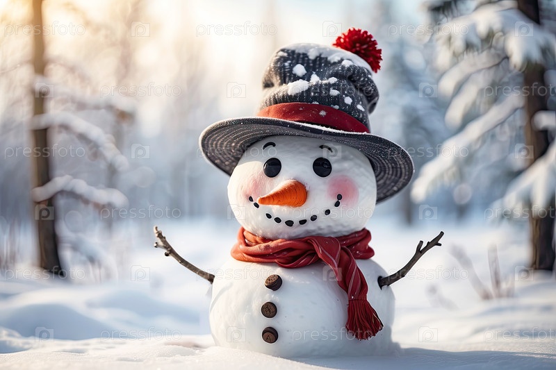 Доброжелательный мультфильм о снежном человеке в вязанной шляпе и шарфе во дворе на фоне уютного ледового леса.Зимняя сказка, снегопады, снежные развлечения, Рождество и Новый год