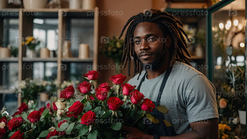 Чернокожий цветочник с дредушками устраивает большой букет красных роз на День святого Валентина или романтическую доставку подарков