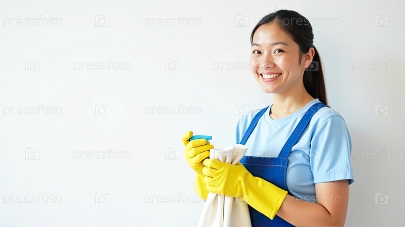 Портрет молодой азиатской женщины в синем фартуке и желтых резиновых перчатках с тряпкой в руке у окна против белой стены, служба очистки окон, уборка дома