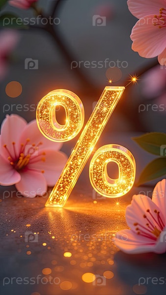 Неон светящийся золотой процентный знак на фоне розового цветения, блеска и лепестков. весенняя распродажа и скидки, 8 марта, Пасха, баннер женского дня, флаер с копировальным пространством. ИИ генерируется