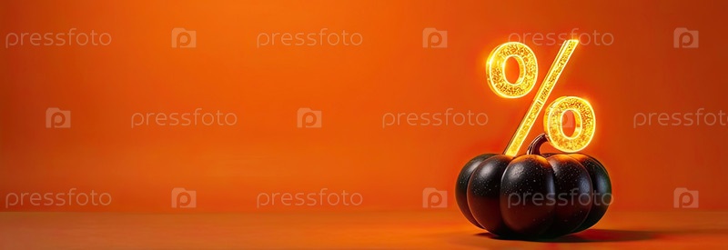 Золотой светящийся процентный знак с тыквой на оранжевом фоне со свободным местом для текста. Осенние распродажи и скидки, баннер Harvest и Halloween, флаер с пространством для копирования. ИИ генерируется
