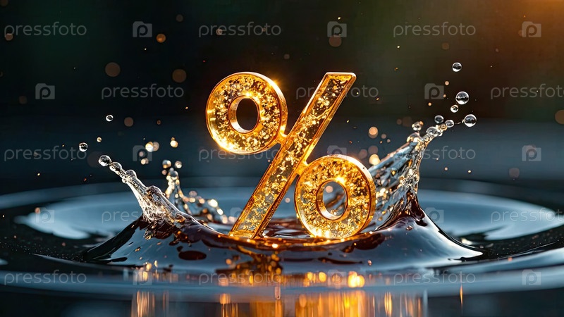 Светящийся золотой процентный знак в освежающем брызге воды над водой. жаркие летние распродажи и скидки, горящие баннеры туров, листовки. ИИ генерируется