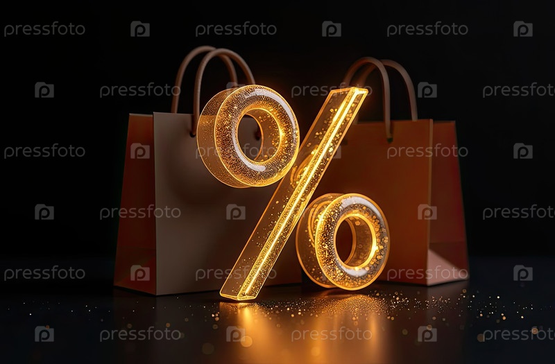 Неон светящийся золотой процентный знак на черном фоне. витрина магазина для Черной пятницы, распродажи, скидки, сумки для покупок. баннер, флаер. AI generated
