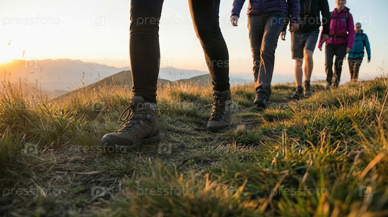 Группа туристов, путешествующих по горной траве, командная работа и приключения, здоровый образ жизни в путешествиях, путешествие на природе, открытый момент вызова