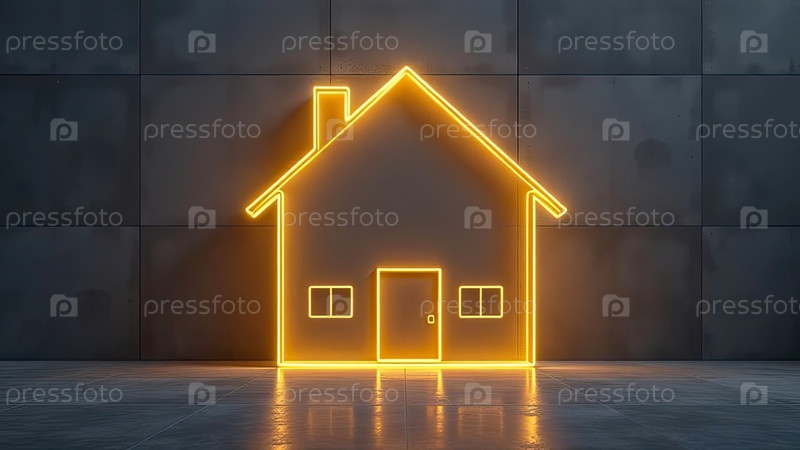 Прозрачное золото светящийся символ дома на сером бетонном фоне с золотым блеском. недвижимость, риэлтор, ипотека, страхование, бронирование, строительство, изоляция, отопление. ИИ генерируется