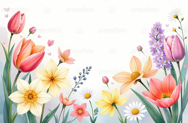 Рамка акварели с весенними цветами тюльпаны, нарциссы-Весенняя открытка со свободным местом для текста на 8 марта, женский день, Пасху