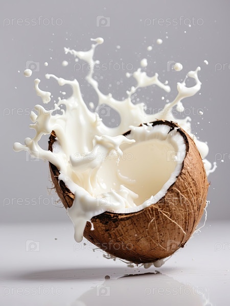 Плески кокосового молока, выплескавшиеся из кокоса в ближайшем кадре на сером фоне
