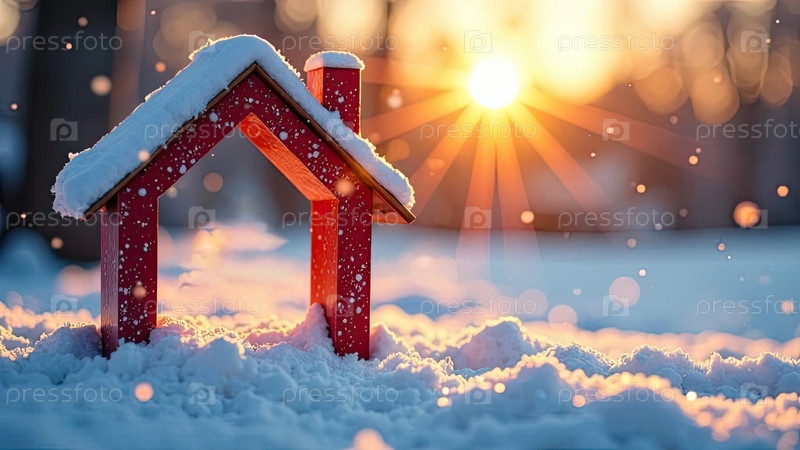 Уютный каркас крошечный дом на снегу и заснеженном фоне в солнечных лучах, с рождественским декором. недвижимость, риэлторская деятельность, ипотека, страхование, бронирование, зимовка, изоляция, отопление. ИИ генерируется