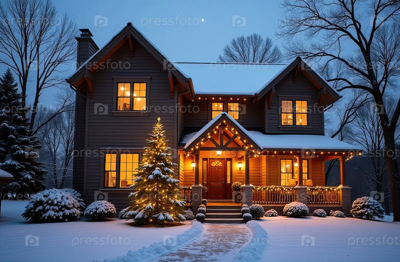 Уютный дом в рождественском декоре и снегу, праздничное настроение. туризм, путешествия зимой, отдых на Новый год, мини-отель, бронирование, страхование, ипотека, жилье, аренда, переезд. современная ИИ генерируется