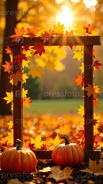 Рама украшена желтыми кленовыми листьями на осеннем фоне с тыквой в лучах солнца. баннер урожая и Хэллоуин, флаер с копировальным пространством. ИИ генерируется