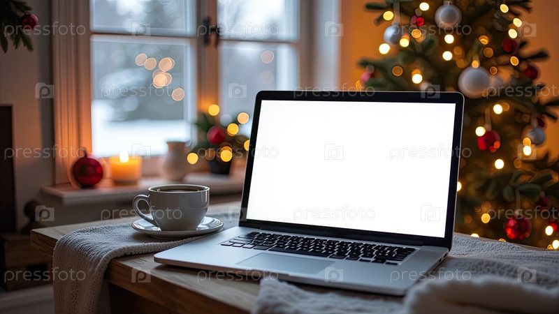 Ноутбук с белым экраном макет на столе в уютном домашнем офисе рождественского декора в стиле лофт