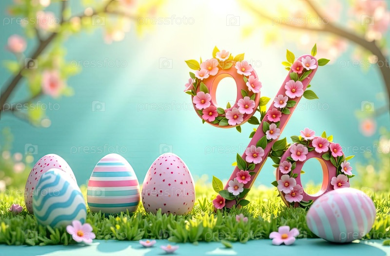Процентный знак и пасхальные яйца в солнечных лучах, украшены весенними пастельными цветами